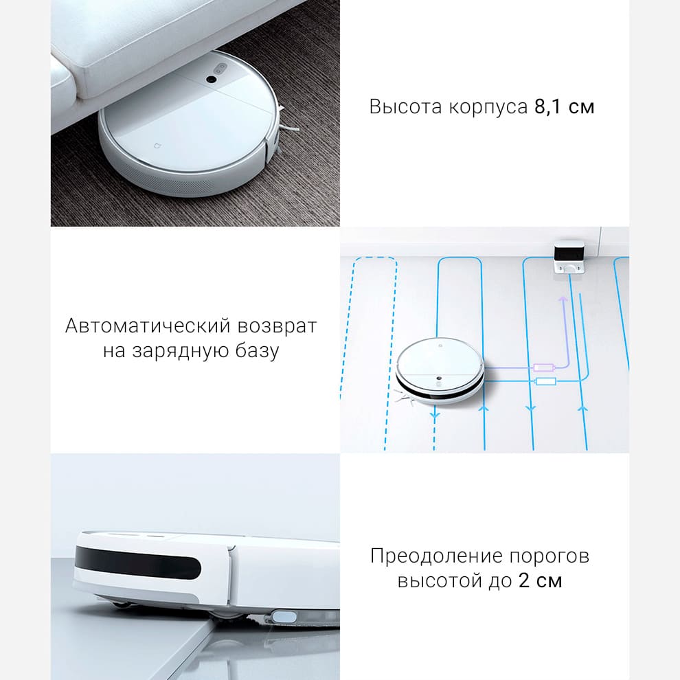 Для повышения эффективности уборки и удобства использования гаджет имеет много полезных особенностей и функций. Высота корпуса составляет 8,1 см, благодаря чему пылесос без труда очищает поверхность под мебелью. При низком уровне заряда он автоматически отправляется на зарядную базу. Возможно преодоление порогов высотой не более 2 см.