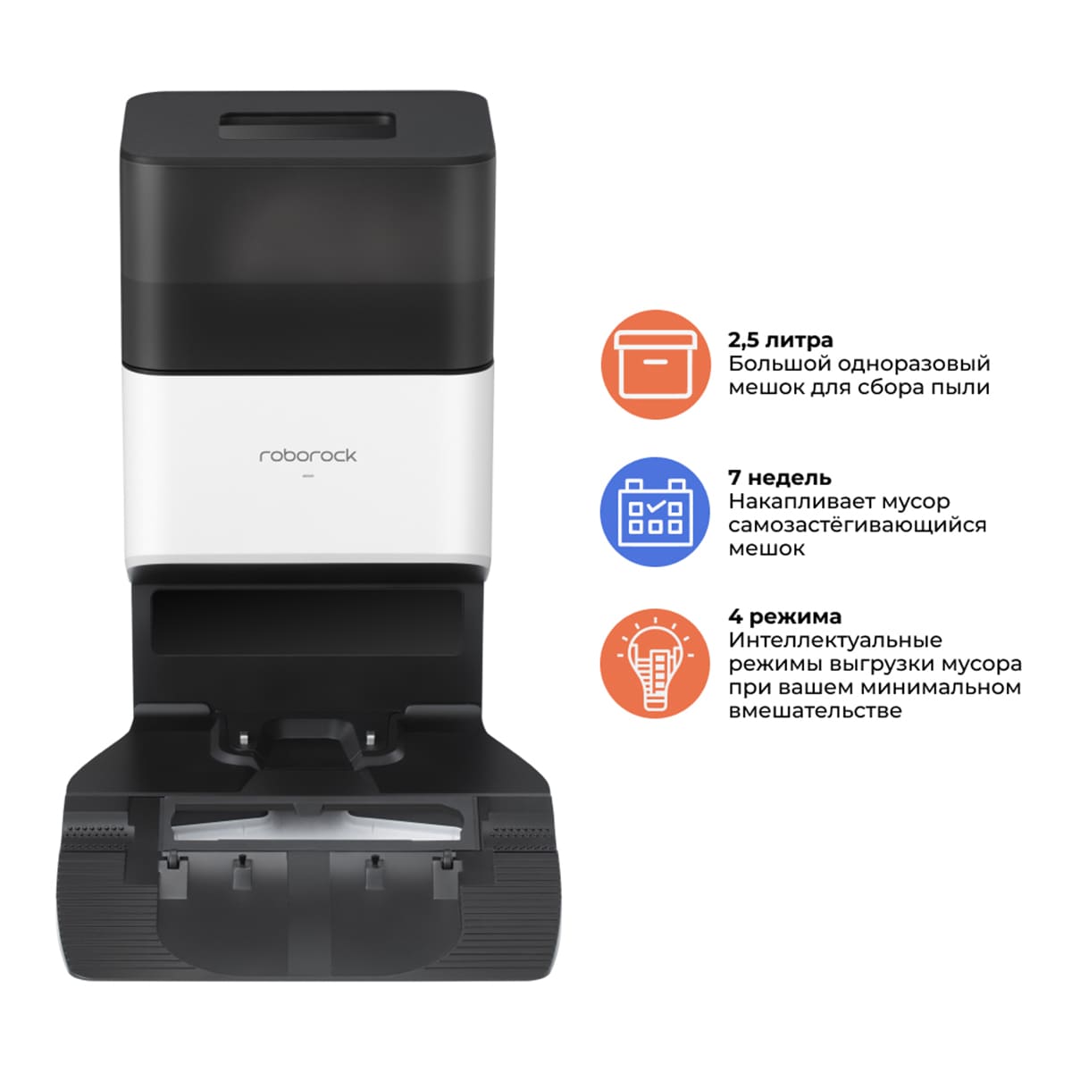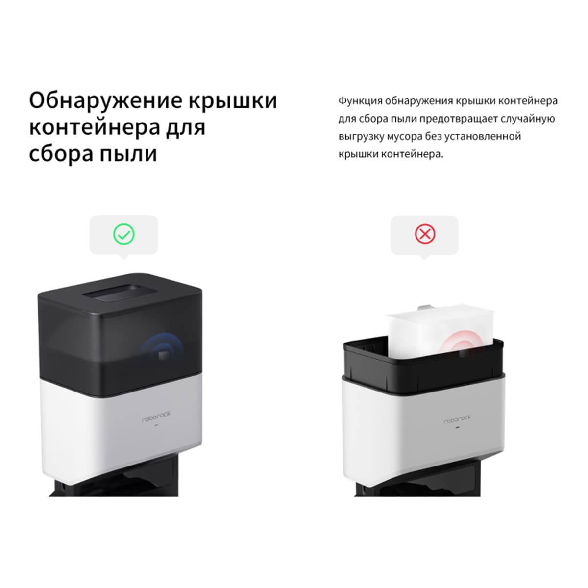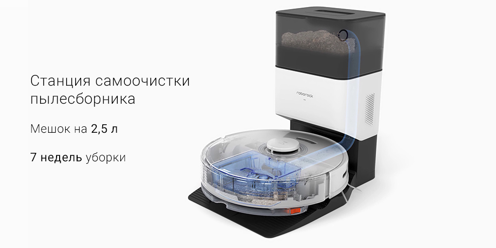 Roborock Q7 Max+ поставляется вместе со станцией самоочистки для пылесборника. В нее устанавливается мешок для мусора объемом 2,5л. За счет этого пылесос может работать в полностью автоматизированном режиме в течение 7 недель.