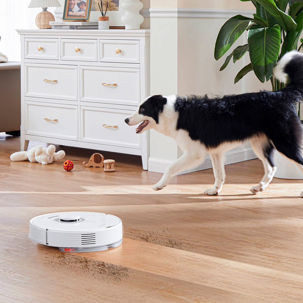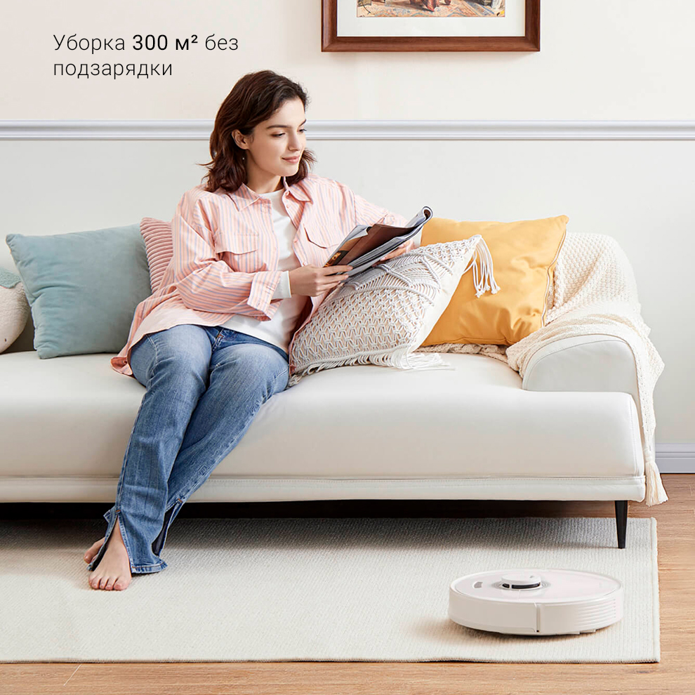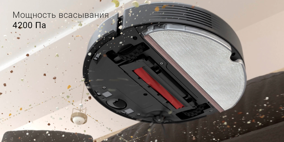 Робот-пылесос удаляет грязь, скопившуюся в коврах, и без труда убирает любой мусор благодаря мощности всасывания в 4200Па.