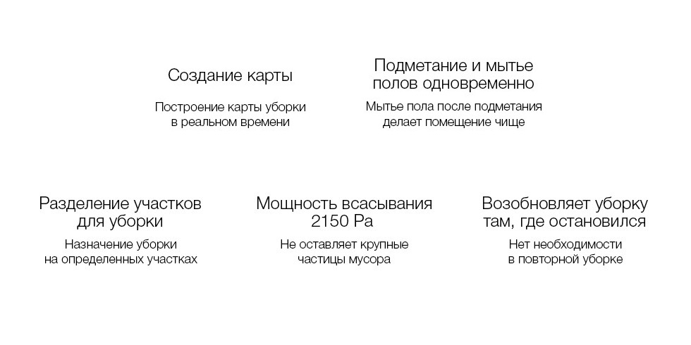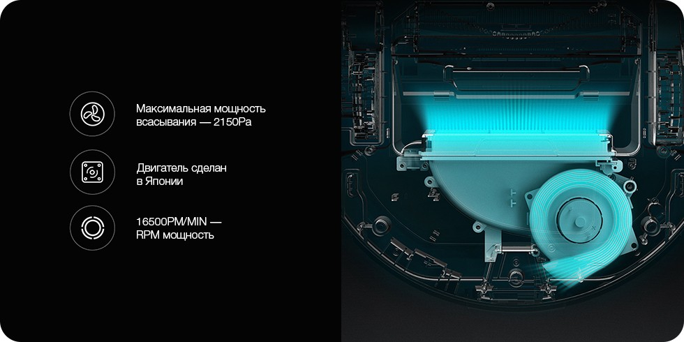 Боковая щетка с переменной скоростью универсальна в применении, так как она тщательно очищает углы и оставляет чистую область нетронутой. Максимальная мощность всасывания - 2150Pa убирает пыль, мусор, рис, крошки и даже стальные шарики.