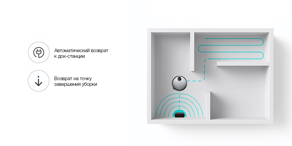 Устройство автоматически вернется на док-станцию при низком заряде,а затем вернется к месту где уборка была закончена. Избегайте повторной уборки, это позволит сэкономить время и повысит эффективность.