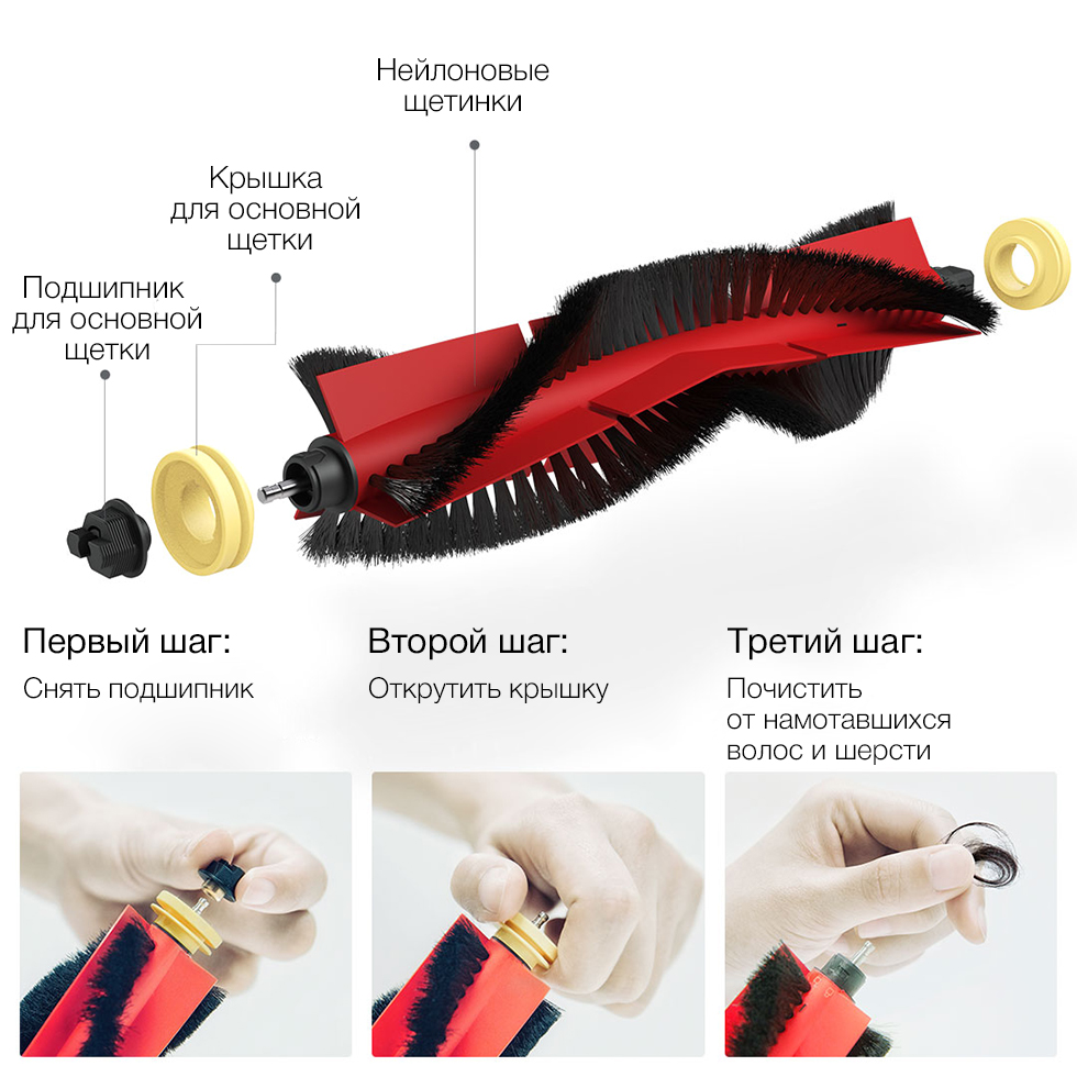 Ворсинки основной щетки изготовлены из нейлона – эластичного и очень прочного материала. Щетка робота-пылесоса съемная, поэтому ее очень легко очистить от намотавшихся волос и шерсти.