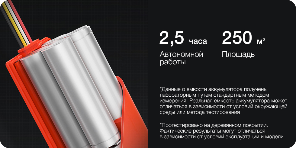 Робот-пылесос оснащен литиевым аккумулятором емкостью 5200 мАч. В стандартном режиме заряда аккумулятора хватит на 2.5 часа непрерывной работы, что равняется примерно 250 кв. м. убранной территории. Используемый комбинированный метод зарядки (заряд методом постоянного напряжения и постоянного тока) гарантирует длительный срок службы аккумулятора.