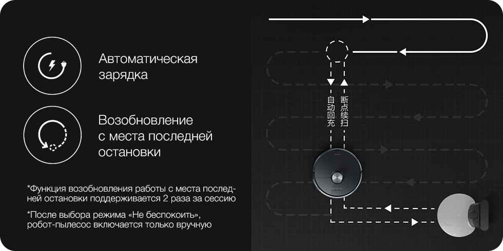 Возвращается на базу, возобновляет уборку с места последней остановки