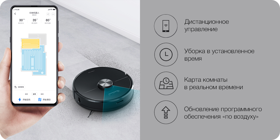 С помощью приложения Mijia APP Вы всегда можете проверить состояние уборки, а также установить время начала и ее область. Обновление программного обеспечения происходит "по воздуху".