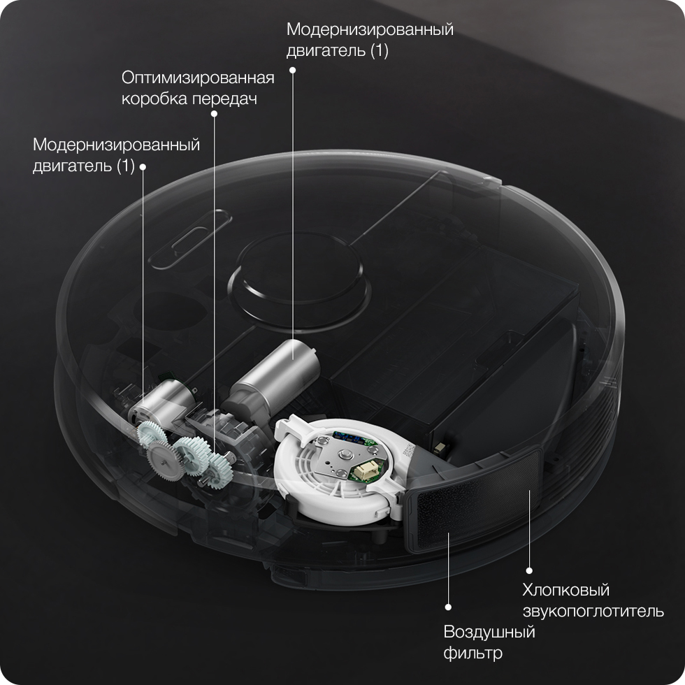 Робот-пылесос оснащен 30.5 мм двигателем с повышенным крутящим моментом, но с пониженной скоростью, благодаря чему также был значительно понижен уровень шума. В то же время, хлопковый звукопоглотитель и воздушный фильтр в сочетании с оптимизированной коробкой передач и двигателем также способствуют эффективному снижению уровня шума при работе.